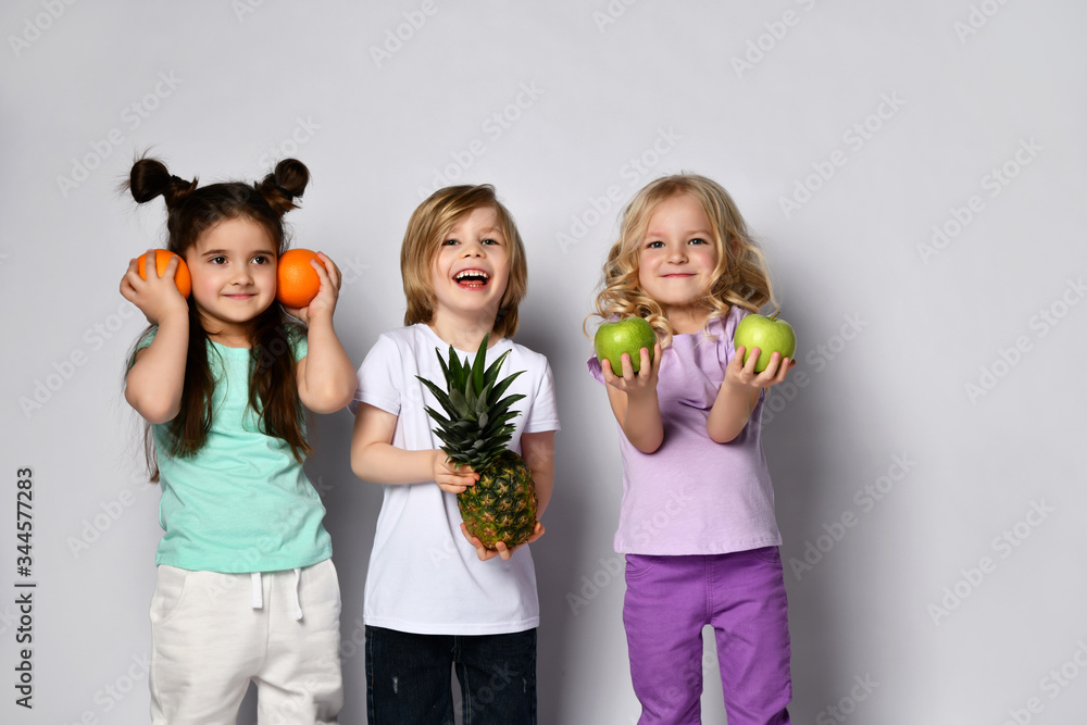 Little boy and girls in colorful casual clothes. Laughing, holding pineapple, oranges and green apples. Posing isolated on white
