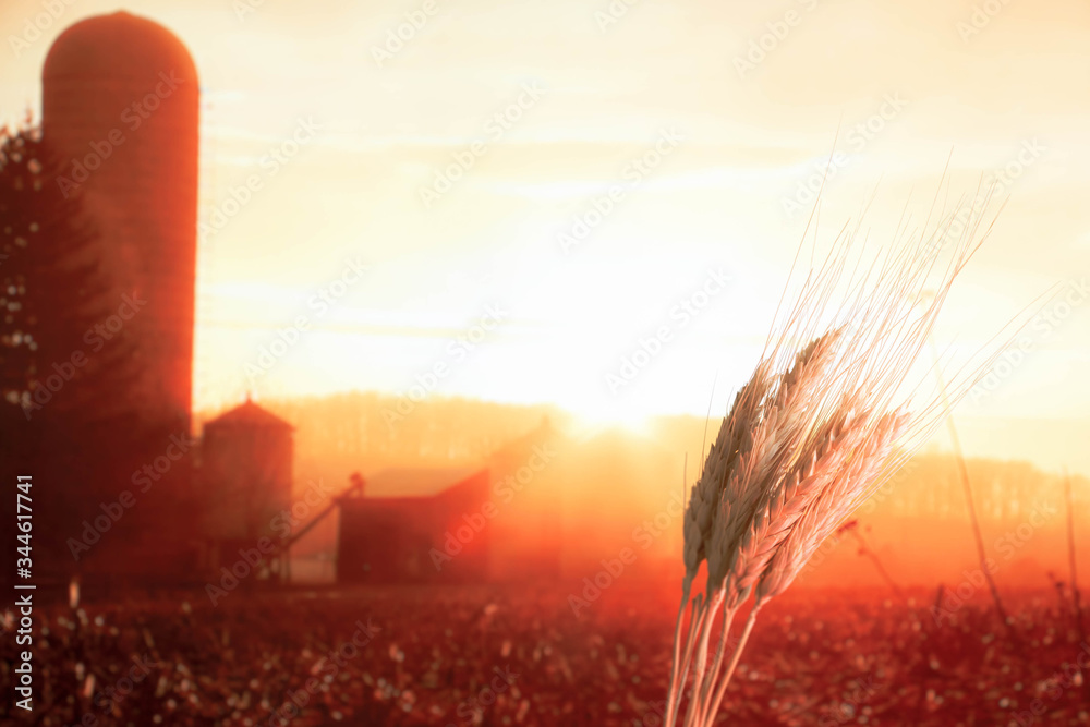 A wheat or barley sheaf with a sunset or sunrise rural farm background.