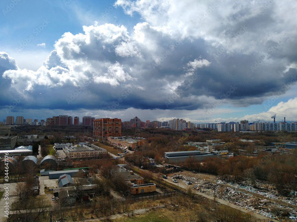 Panorama aerial photo of a big city with multi-story residential buildings from a height in sunny weather with beautiful contrasting clouds and a distant horizon