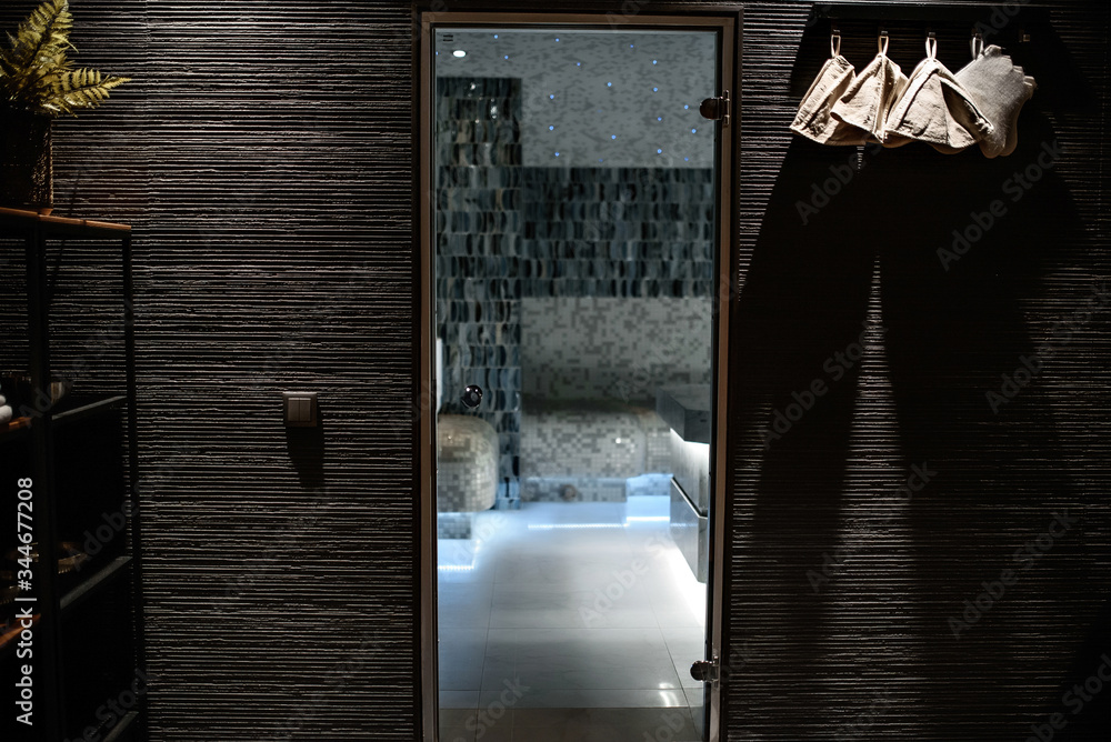 glass door entrance сдщыу гз. Interior of luxury turkish bath hammam. Traditional Turkish bathroom. Classic Turkish sauna hammam