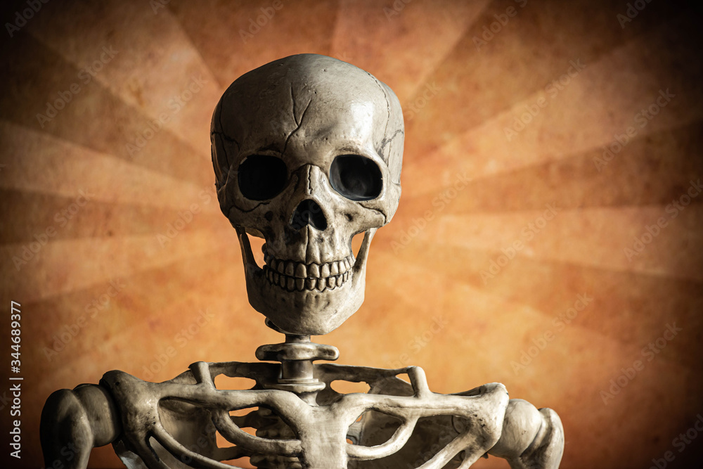 A plastic skeleton with a rugged grunge background of stripes or rays.
