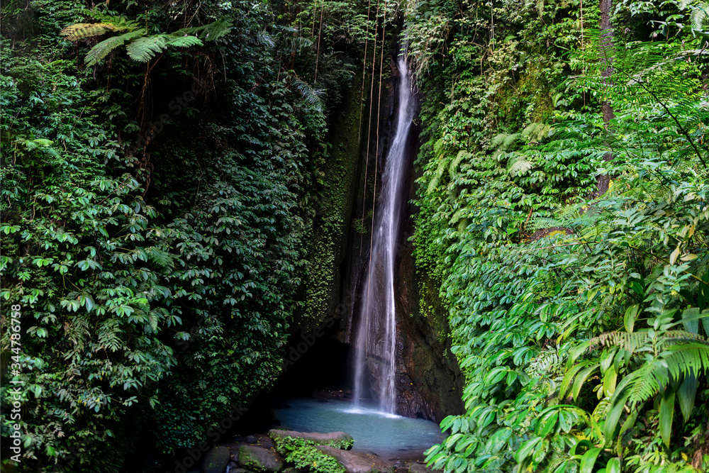 A waterfall falls beside a dark cave, pooling in a clear waterfall vault