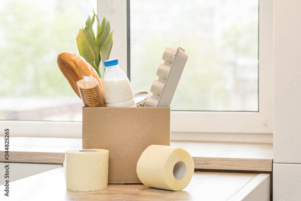 Donation box with food on a light interior background. Food delivery during the epidemic of Covid-19, coronavirus. Copy space. Food Delivery Concept. Space for text.