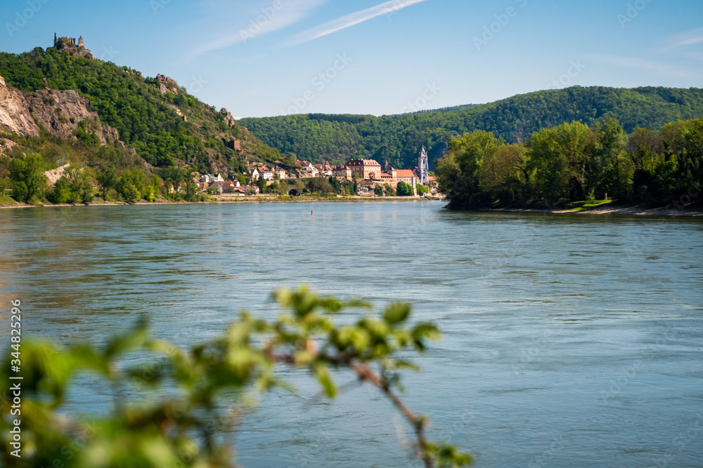 River Danube and Duernstein with the Kuenringer Castle and Blue and White Tower of the Abbey Church in the Wachau Valley, Austria