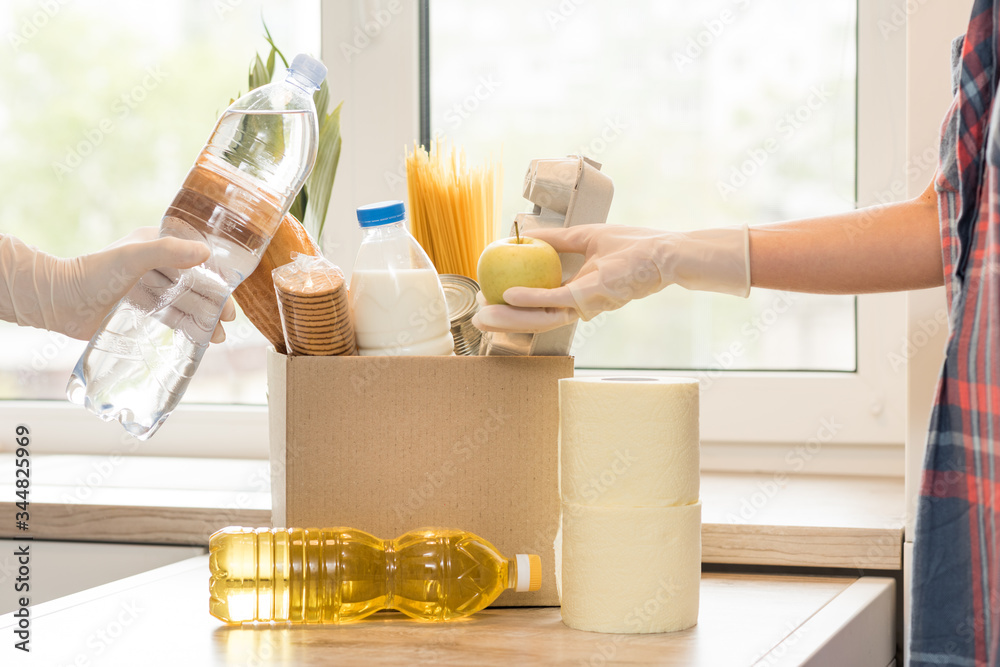 Donation box with food on a light interior background. Food delivery during the epidemic of Covid-19, coronavirus. Copy space. Food Delivery Concept. Space for text.