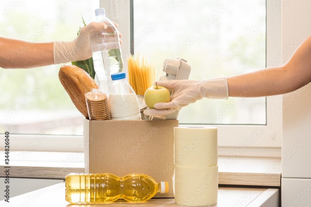 Donation box with food on a light interior background. Food delivery during the epidemic of Covid-19, coronavirus. Copy space. Food Delivery Concept. Space for text.