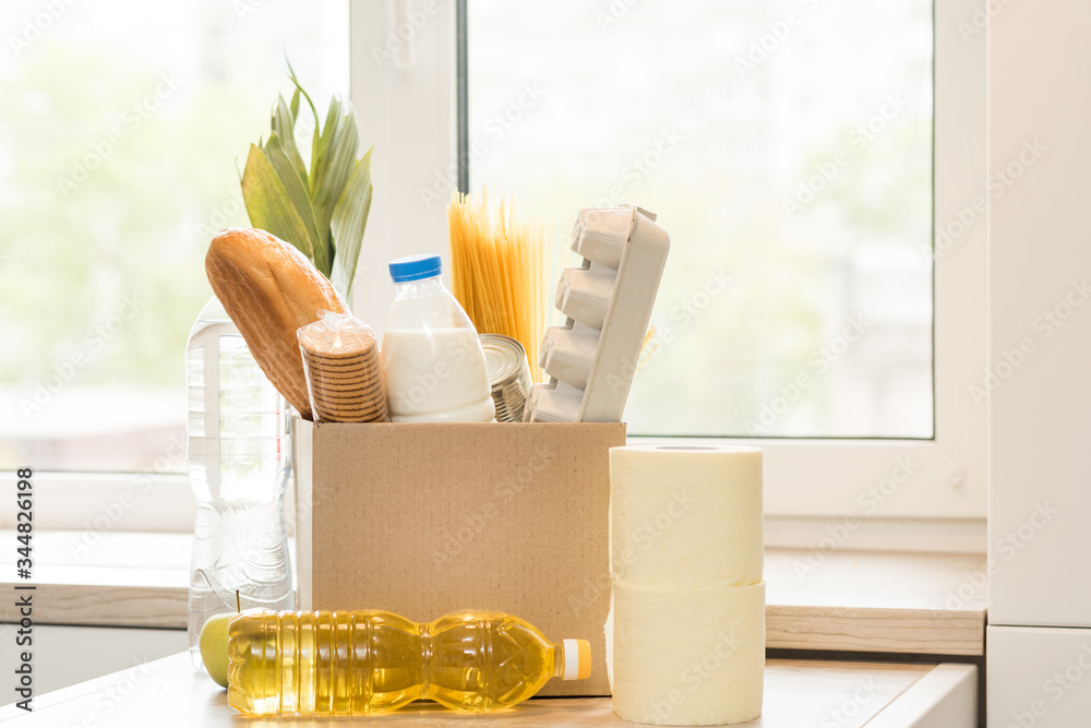 Donation box with food on a light interior background. Food delivery during the epidemic of Covid-19, coronavirus. Copy space. Food Delivery Concept. Space for text.