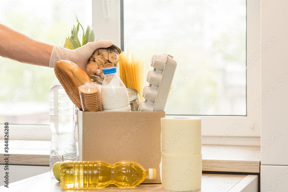 Donation box with food on a light interior background. Food delivery during the epidemic of Covid-19, coronavirus. Copy space. Food Delivery Concept. Space for text.