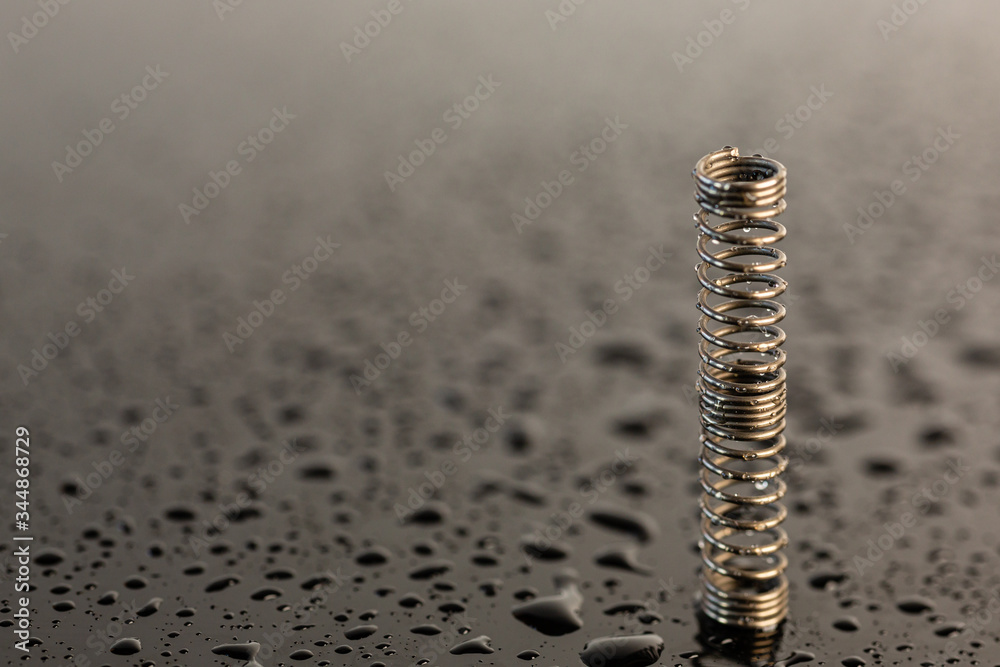 Metalowa sprężyna. Druciane elementy. Fragment dlugopisu. Metalowe elemnty urzadzenia. Matal i woda.