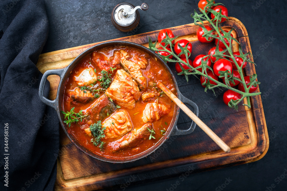 Traditioneller brasilianischer Fisch Moqueca Baiana mit Fischfilet in Tomaten Sauce als Draufsicht in einem Modern Design Gußtopf