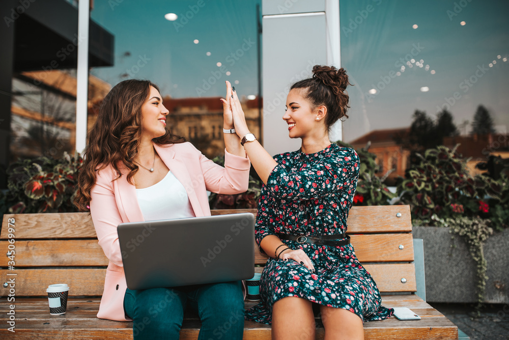 Happy female friends are giving high five, celebrating success and looking each other while reading good unexpected news on laptop