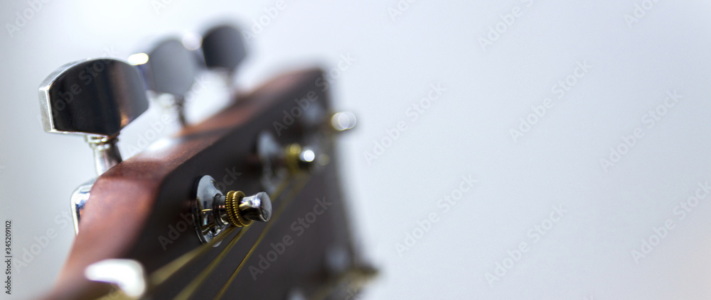 The upper part of the classical guitar, metal, shiny tunes, guitar detail.