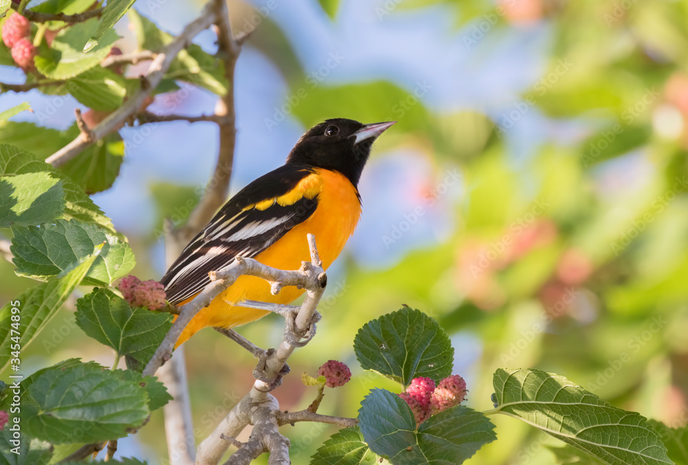 The Baltimore oriole feeding on the mulberrie tree during spring migration. Galveston, Texas, USA
