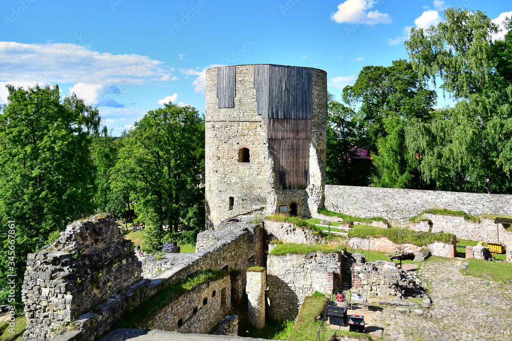 Cesis, Latvia - Cesis castle, tower and ruined stone walls on a background of green trees and blue sky with clouds, in the summer in the daytime.
