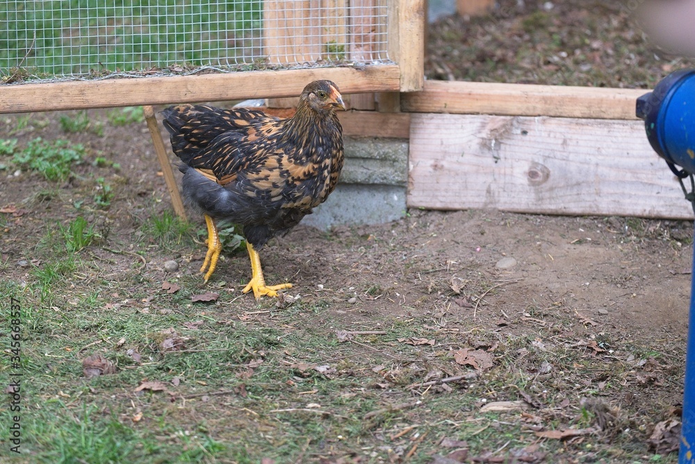 Young chickens roaming around in the grass outside