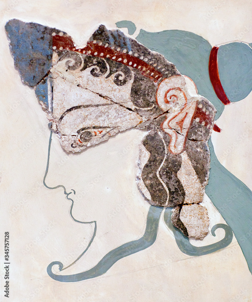 Mycenaean fresco wall painting fragment depicting a woman from a ceremonial procession in Tiryns palace, Argolis, Greece