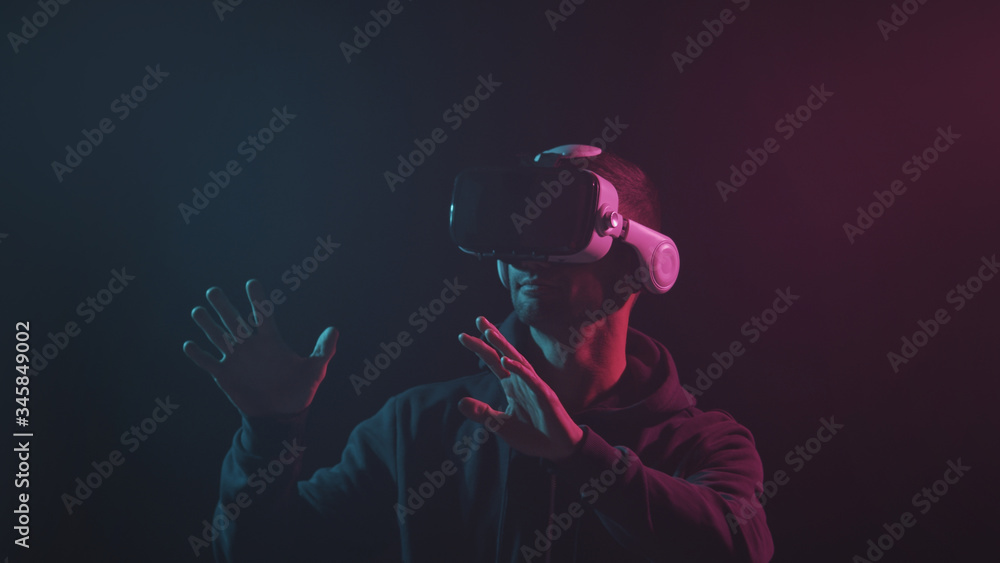 Portrait of a man in virtual reality helmet. Obscured dark face in VR goggles. Internet, darknet, gaming and cyber simulation.