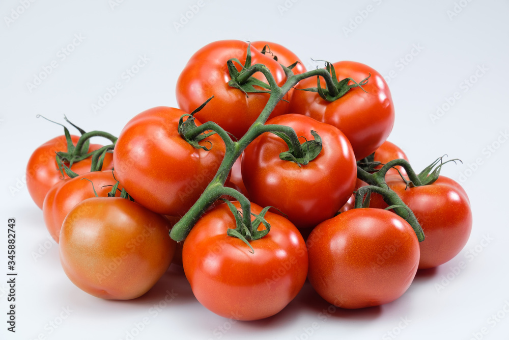 Eine Menge, ein Haufen frischer roter saftiger Rispentomaten / Tomate