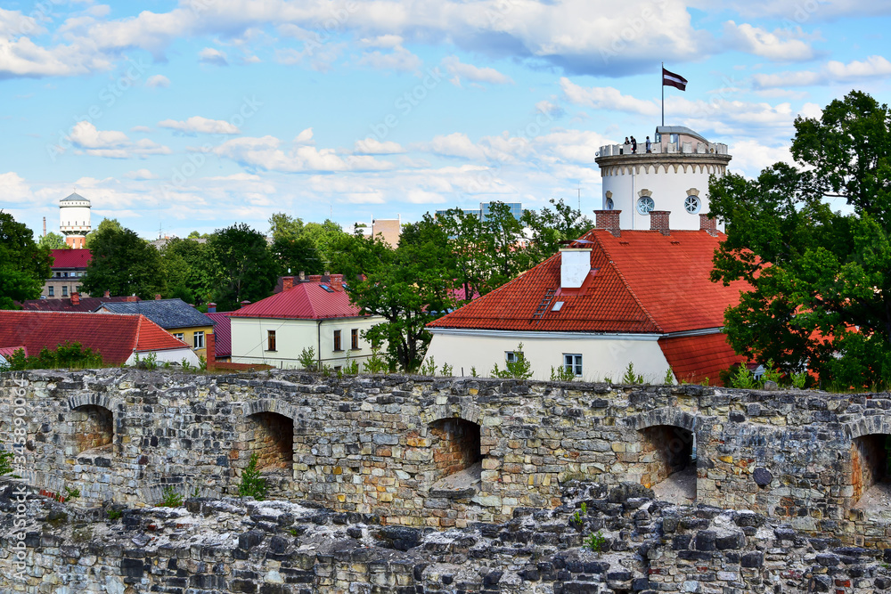 Cesis, Latvia - The stone wall of the old castle beyond which is visible the Cessian new castle, a historical and art museum, a building with a neo-Gothic tower, a blue sky with clouds.