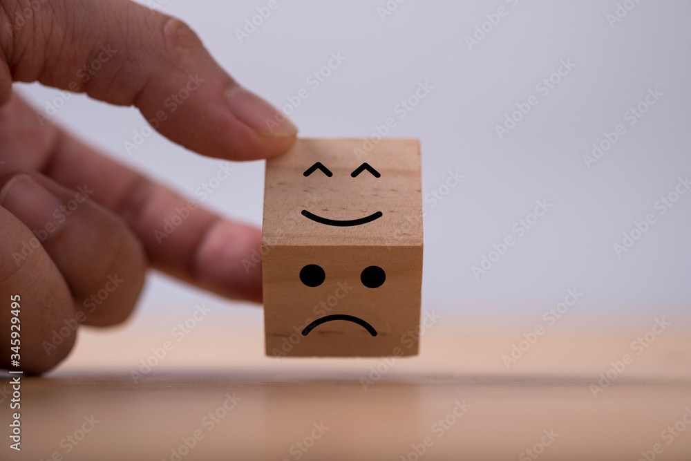 Hand flipping change emotions from sad to happy which print screen on wooden cubic. Customer experience survey and satisfaction feedback concept.