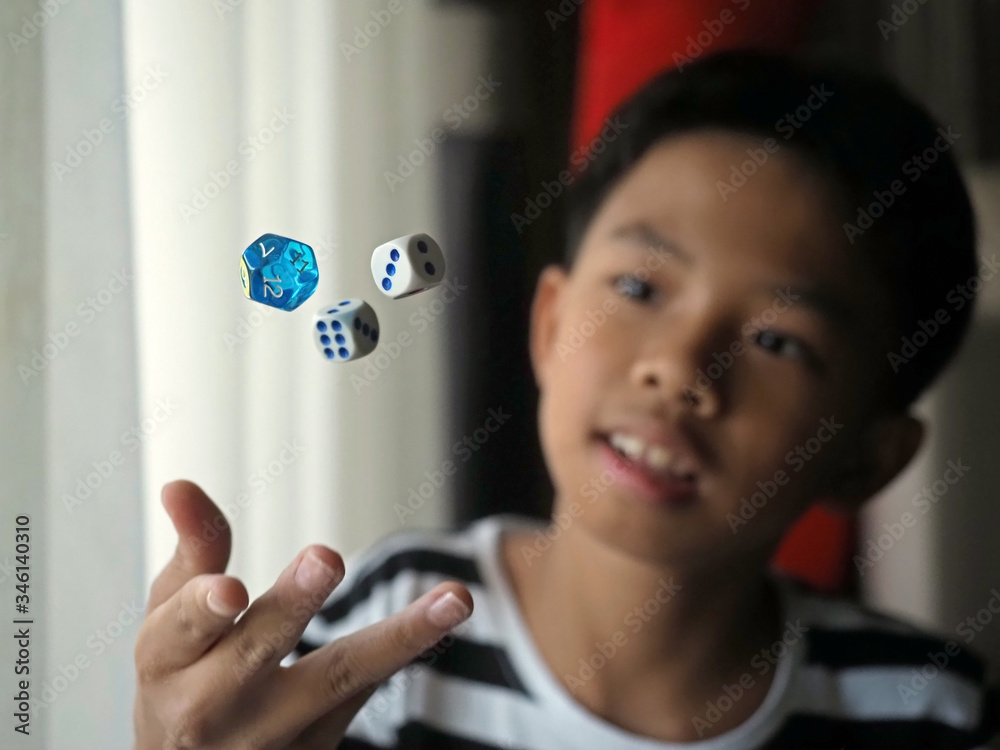 Closeup of an Asian boy throwing the dices up into the air. Selected focus.
