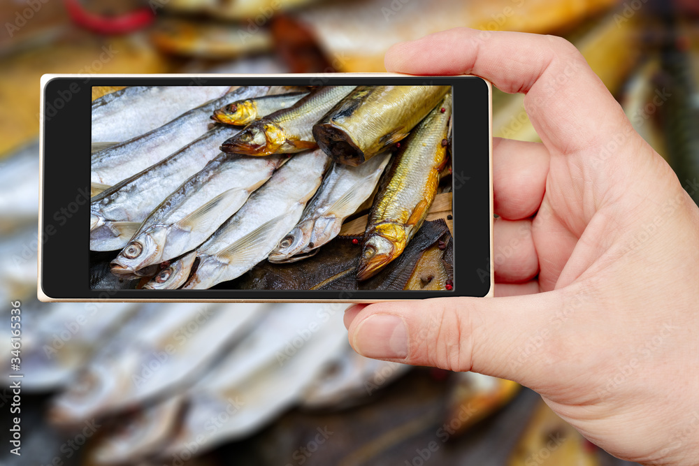 Smoked fish on smartphone screen. Seafood sale. Fish in shop window.