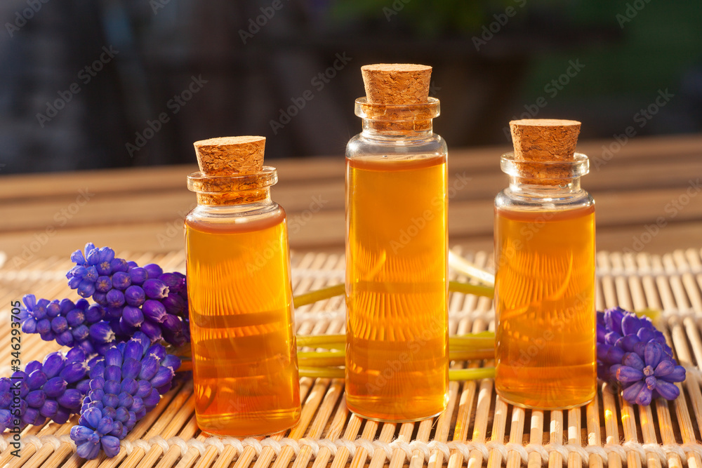 Essential oil of muscari flower on a table in beautiful bottle