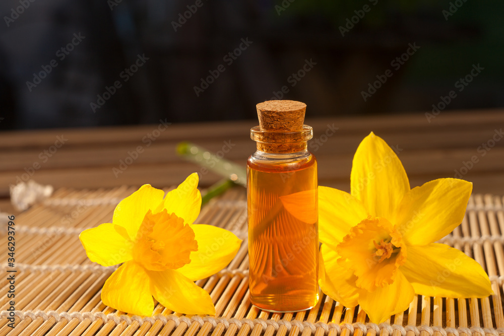 Essence of flowers on white in beautiful glass jar