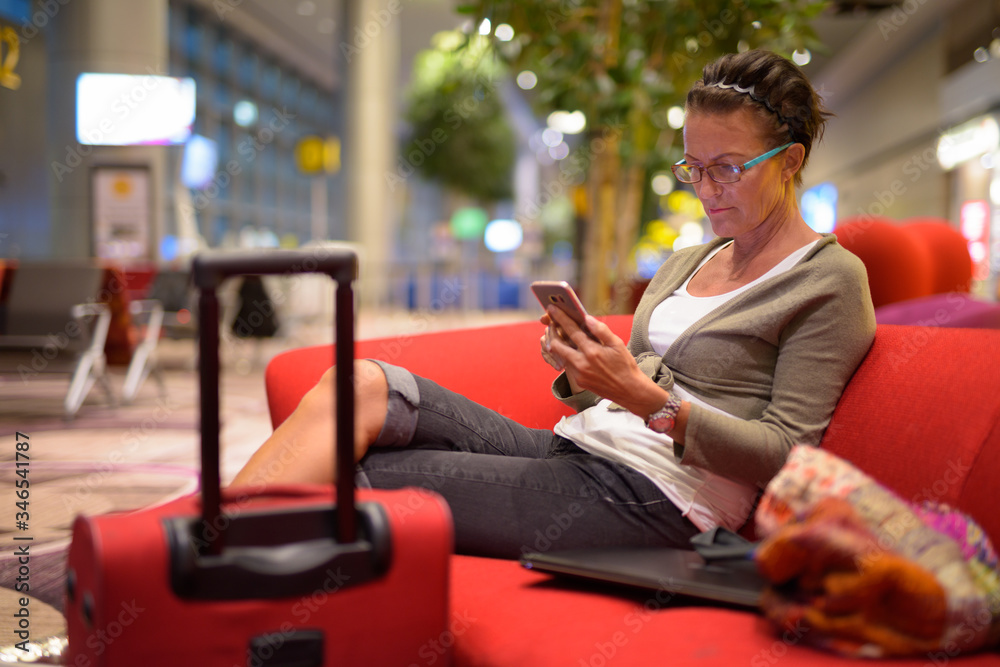 Mature beautiful tourist woman using phone at the lounge indoors