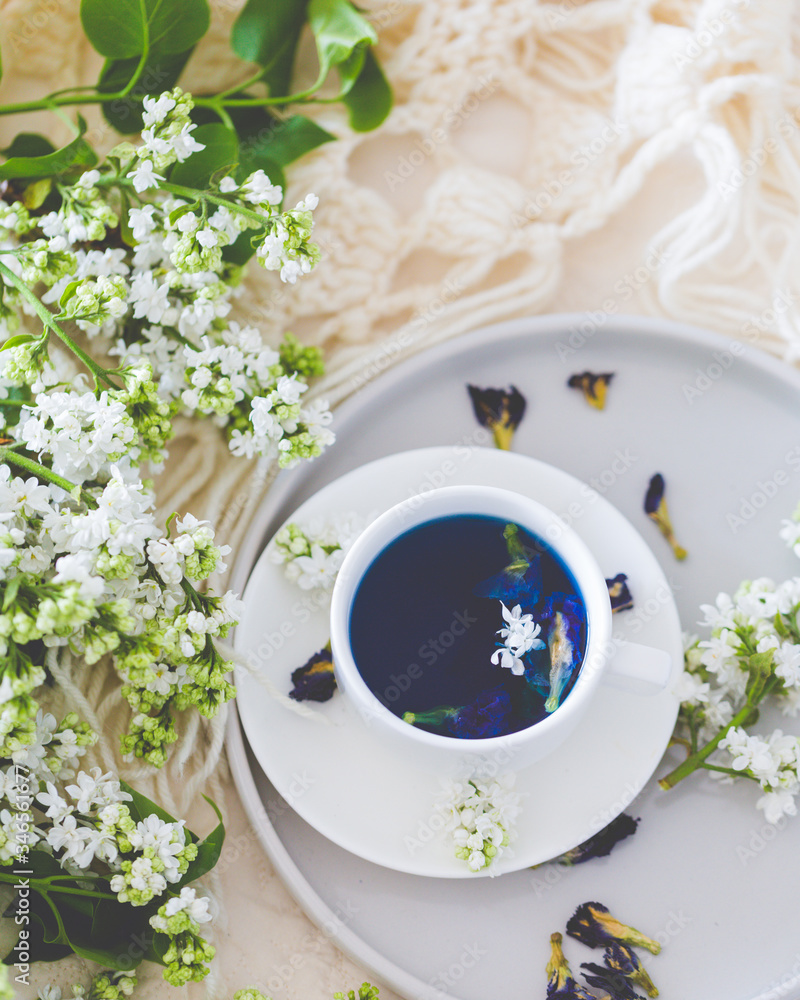 Cup of Butterfly pea tea (pea flowers, blue pea) for healthy drinking, detox drinking and white lilac. Relax time, pay yourself first