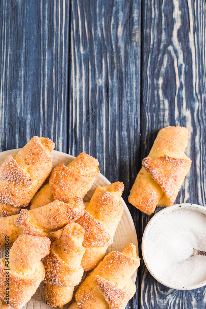 homemade cottage cheese mini croissants on a blue wooden background. breakfast with croissants