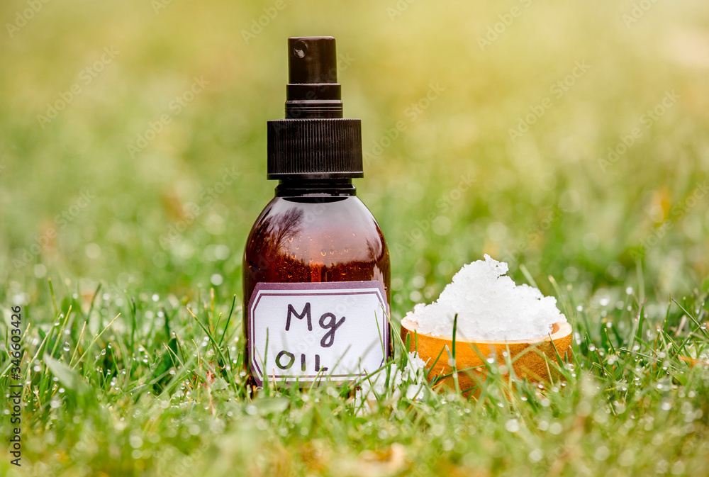 Magnesium Chloride Flakes on brown wooden cup with Magnesium vitamin oil in spray bottle in grass outdoors with blurred bokeh green background.