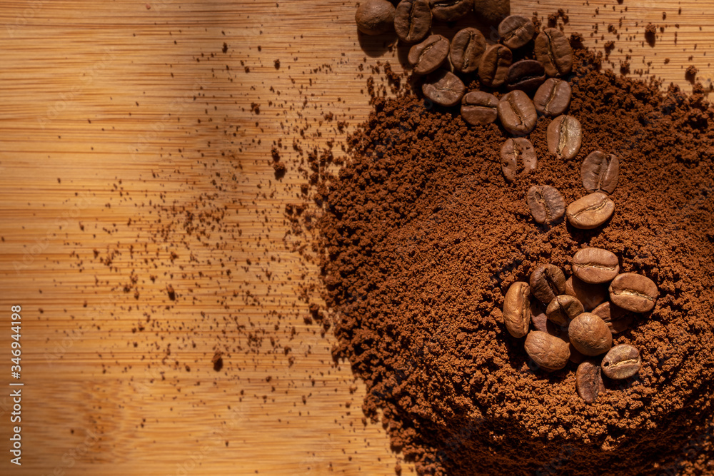 Top view of coffee beans and ground coffee on wooden background, roasted coffee volcano like anthill