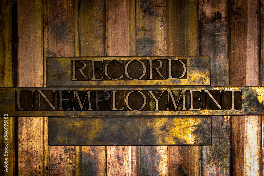 Photo of real authentic typeset letters forming Record Unemployment text on vintage textured grunge copper and black background