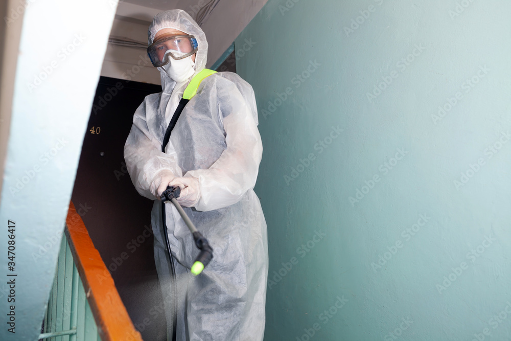 Man performs sanitization at the entrance of a house from coronavirus, infections insects or mice In protective overalls