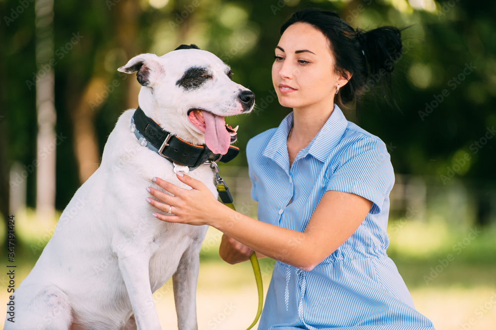 Beauteous woman sits with her lovely dog in the park and rejoices