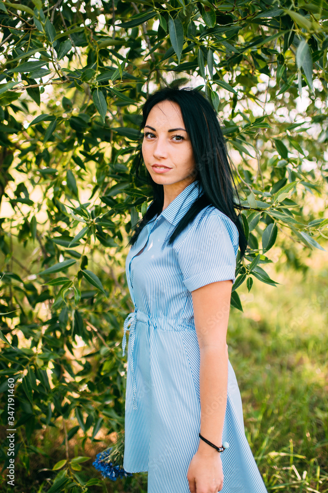 Nice girl with big eyes, long dark hair and pretty smile on the green background