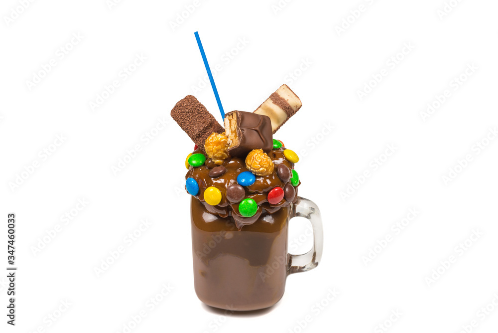 Chocolate milkshake with whipped cream, cookies, waffles, served in glass mason jar. "Freak or crazy" sweet shake. Isolated.
