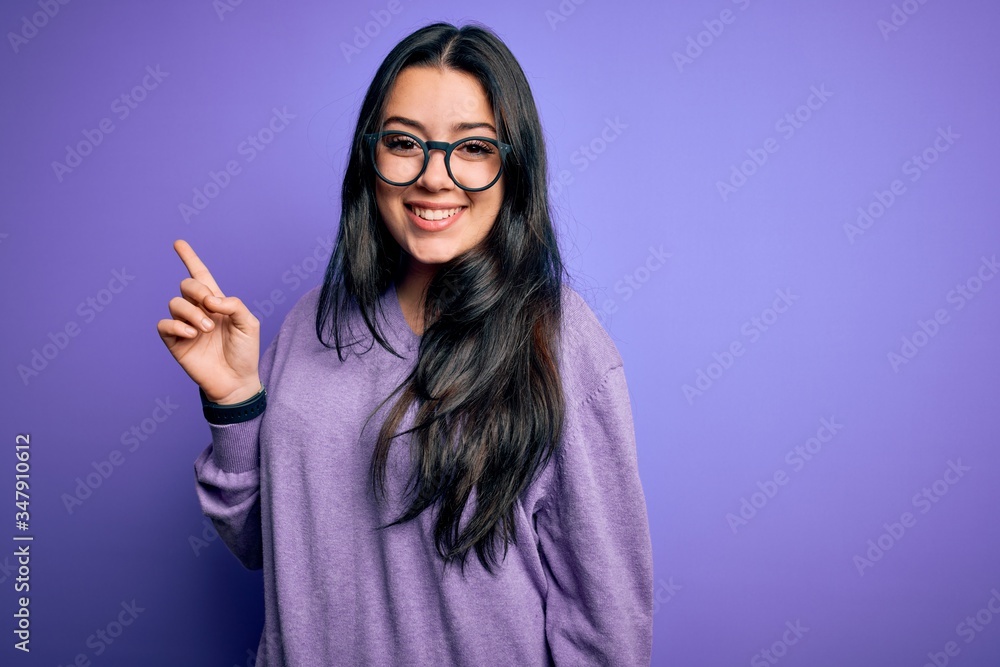Young brunette woman wearing glasses over purple isolated background with a big smile on face, pointing with hand and finger to the side looking at the camera.