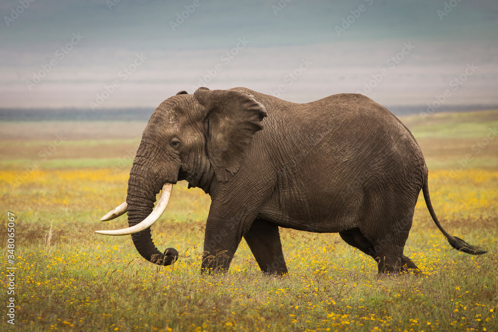 Elephant eating grass during safari in National Park of Ngorongoro, Tanzania. Beautiful yellow flowers around him. Wild nature of Africa.