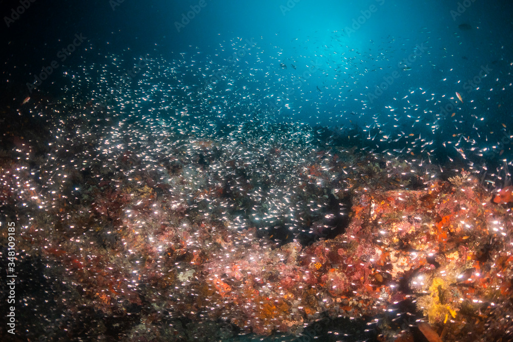 Tropical fish swimming around colorful reef formations