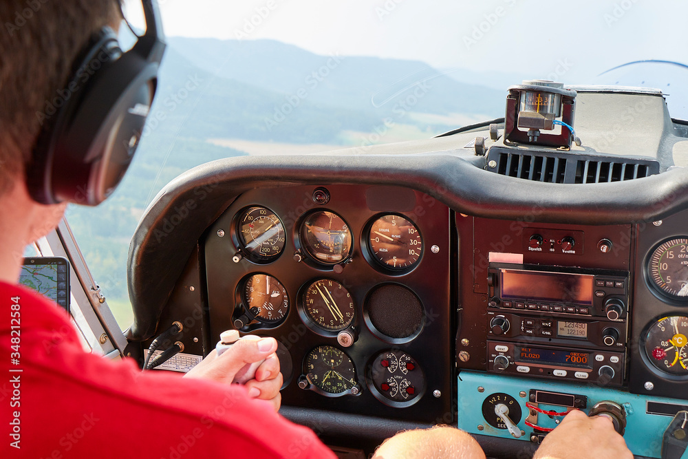Close up of a man in a cockpit piloting small four seat airplane with hills and meadows in a distance