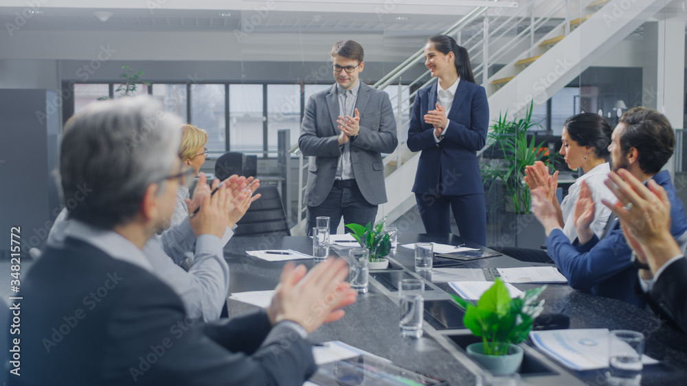 In the Corporate Office Meeting Room: Two Young and Ambitions Start-up Creators Give a Speech to a Group of Venture Capital Investors, Businesspeople Cheer and Applaud in Successful Agreement