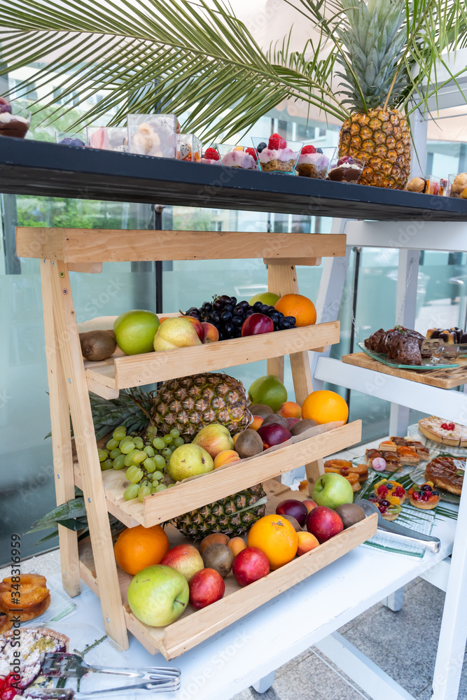 Candy bar food buffet by the pool, during hotel brunch, catering in the garden, food bloggers event