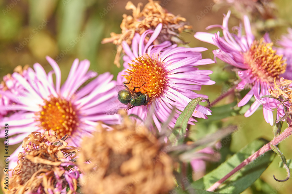 Fall. A fly collects the last nectar and pollen from perennial aster flowers.