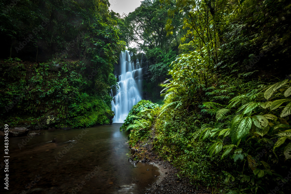 Waterfall landscape. Beautiful hidden Cemara waterfall in tropical rainforest in Sambangan, Bali. Slow shutter speed, motion photography.