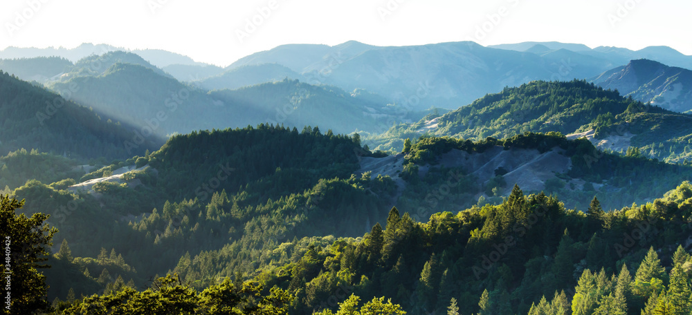 View of the hills, mountains, forest and valleys and many peaks of Armstrong Woods in California USA