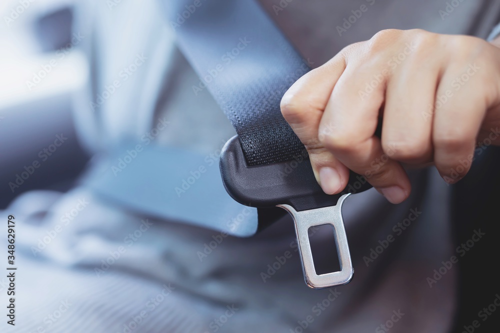 Close Up of people woman hand fastening seat safety belt in car for safety before driving on the road. concept transport travel. soft focus.