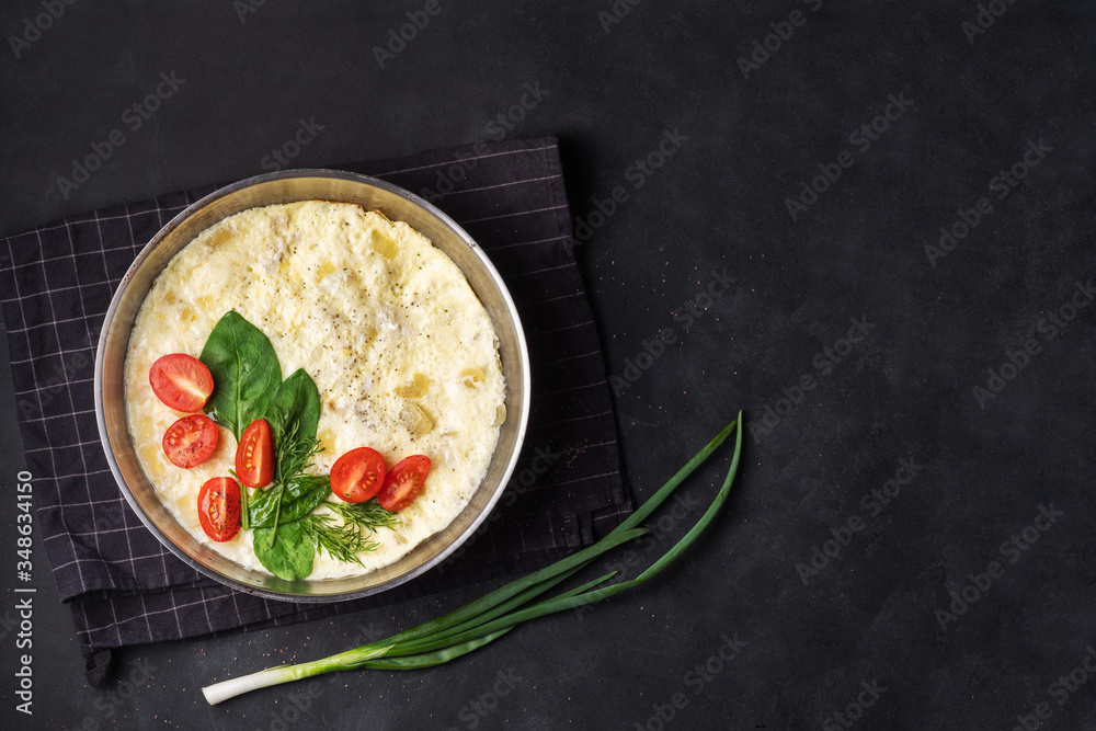 Omelette with fish on a black background top view with copy space. Healthy eating concept