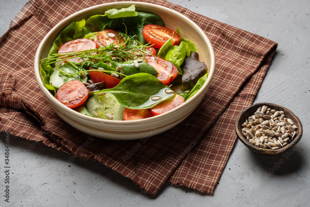 Salad of fresh tomato, spinach, fennel, lettuce on a gray blackground .Healthy tasty food, homemade concept.